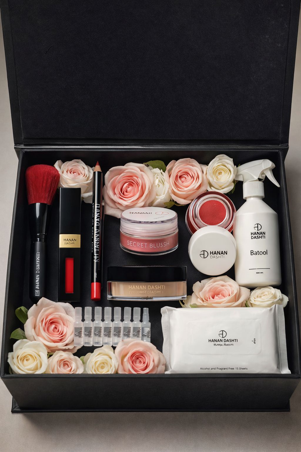 Valentine's Package Love Yourself Box 2 consist of Secret Blush, Lip liner, Lip Powder Darya, Lip Scrub, Makeup removing Wipes, Collagen Ampoules, Loose Powder, Batool Home Spray and Red Brush.